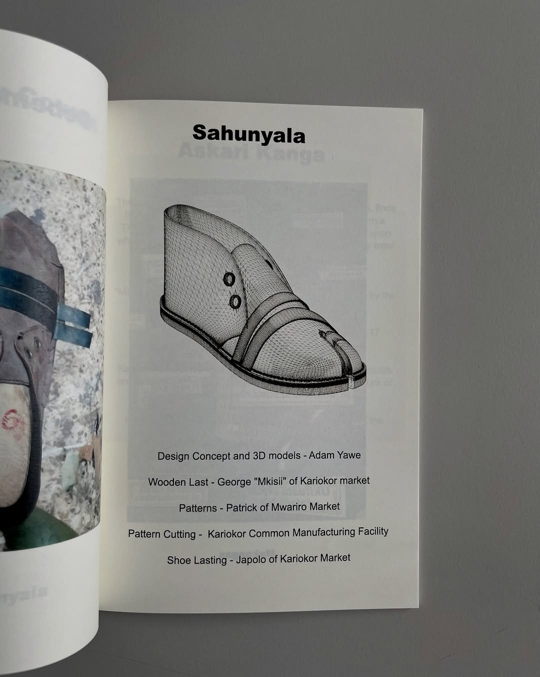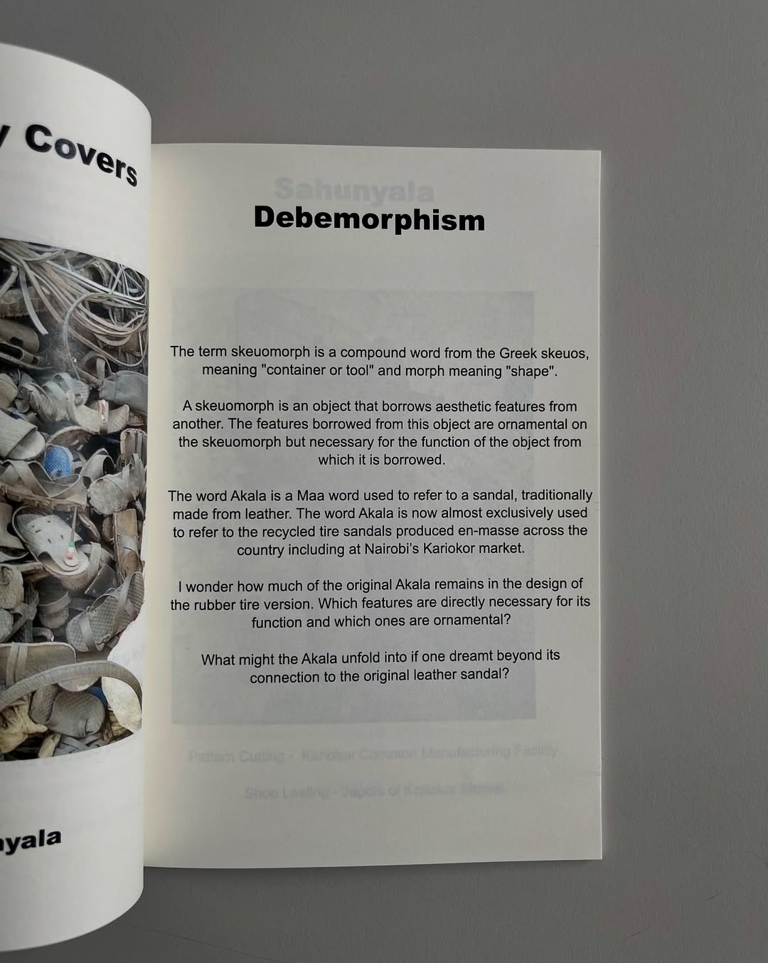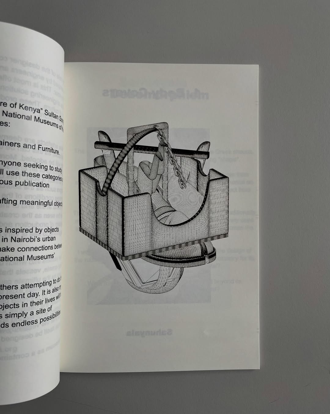 In his 1993 publication "Material Culture of Kenya," Sultan Somjee classifies material culture into 5 categories: Body covers, Tools, Ornaments, Furniture and Containers. In "Debe - A Container for Material Culture", Adam Yawe places a selection of his design objects into the same 5 categories. Inviting the viewer into the process and ultimately his practice, with texts, patterns, photographs and more.